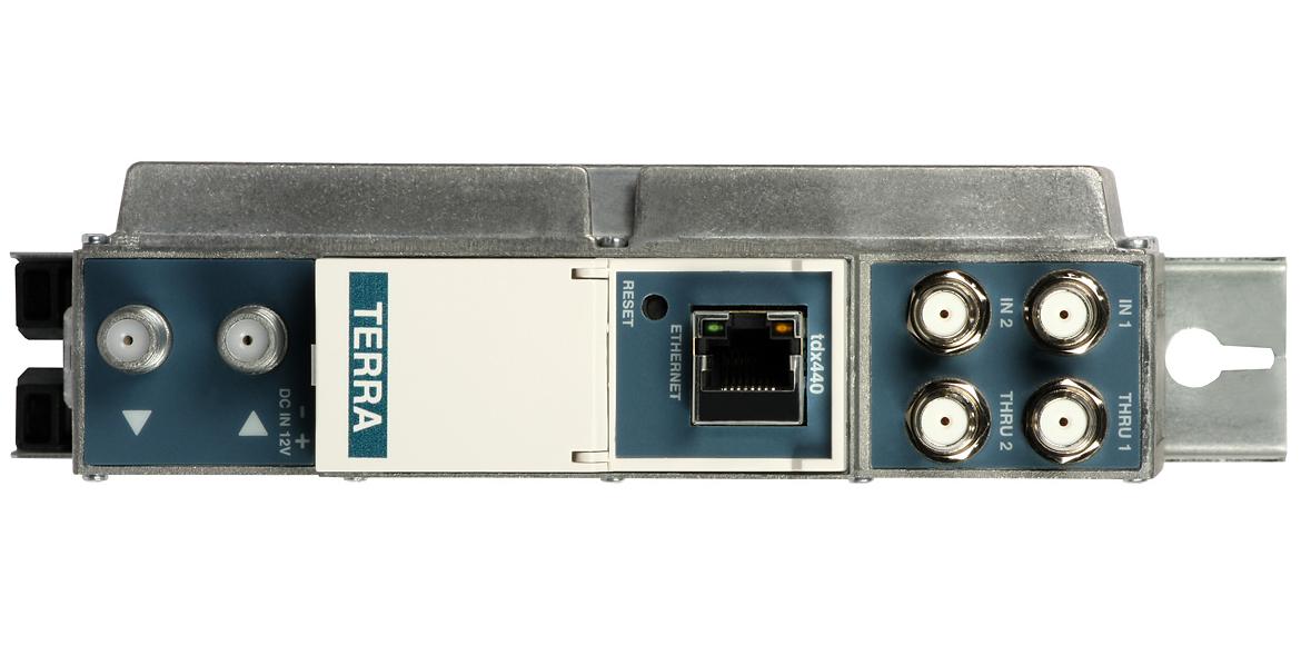 Terra tdx440 DVB-S/S2 to DVB-T transmodulator is used for reception of DVB-S/S2 (8PSK/QPSK) signals, selection of desired channels and retransmission of them in COFDM format in chosen RF channels in VHF/UHF frequency range. The device allows the user to receive and manage a range of free to air satellite channels. One tdx440 unit can receive channels from eight satellite transponders and convert selected channels into four neighboring DVB-T multiplexes, each with maximum throughput of 31.66 Mbps. In practice, each of the four multiplexes can carry 6 SD channels or 2-3 HD channels. The administrator of the system selects the required channels from the satellite streams and forms four DVB-T multiplexes. In each case, it is necessary to remember about 10% safety margin when determining the maximum bitrate for the whole multiplex (typically the ultimate bit rate of a multiplex should not exceed 29 Mbps). The output DVB-T COFDM multiplexes are usually distributed to users by a passive network composed of RF splitters. Such a solution is especially convenient in modern hotel or motel TV systems distributing a variety of satellite channels, including HD broadcasts.
